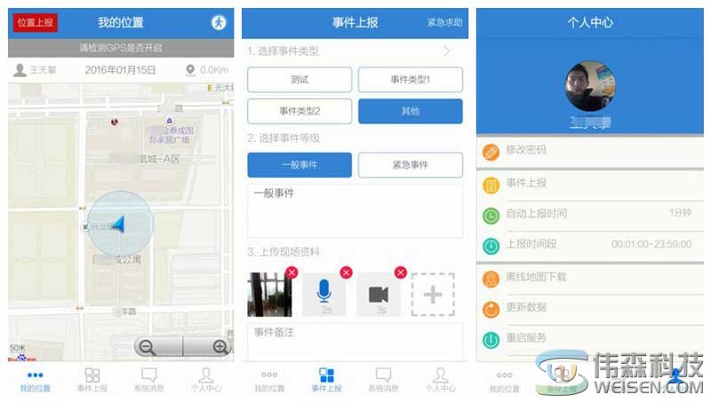 智能巡防 事件紧急调度处置 伟森智能巡防系统助力巡防自动化,在移动智能设备的基础上设计研发了手机客户端App,客户端实现巡防事务中的拍照,录音和视频功能以及一键报警,方